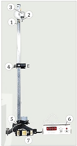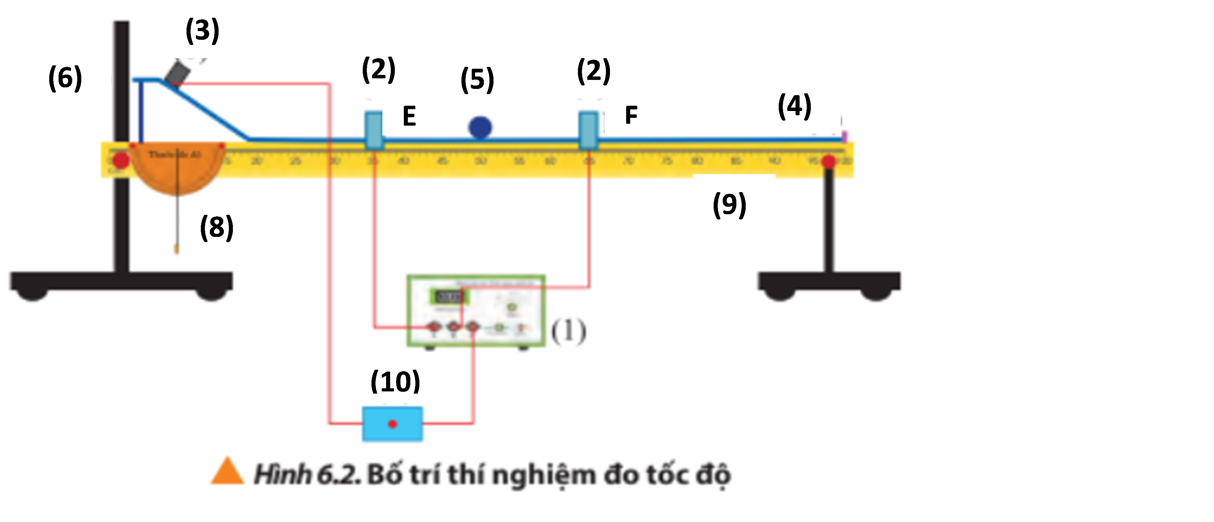 (1): đồng hồ đo thời gian hiện số MC964. (2): cổng quang điện. (3): nam châm điện và công tắc sử dụng để giữ/thả viên bi thép. (4): máng có giá đỡ bằng hợp kim nhôm, có gắn thước đo góc và dây rọi. (5): viên bi thép (6): giá đỡ có đế ba chân, có vít chỉnh cân bằng và trụ thép. (7): thước cặp để đo đường kính viên bi thép. (8): Thước đo độ có gắn dây dọi. (9): Thước thẳng có độ chia nhỏ nhất 1mm. (10): Công tắc điện. |
