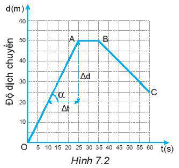 - Độ dốc của đồ thị độ dịch chuyển - thời gian trong chuyển động thẳng đều cho biết độ lớn của vận tốc chuyển động.- Ví dụ, trong hình 7.2, trong giai đoạn OA thì vật có độ lớn vận tốc là: