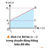 + Độ dịch chuyển của vật trong khoảng thời gian từ t1 đến t2 được xác định bằng phần diện tích giới hạn bởi các đường v(t), v = 0 (trục hoành Ot), t = t1, t = t2 trong đồ thị (v - t).