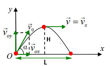 \(t=\sqrt{\frac{2H}{g}}\) - Tầm bay xa:\(L=d_{max}=v_0.t=v_0\sqrt{\frac{2H}{g}}\) - Vận tốc ở thời điểm t:\(v=\sqrt{v_x^2+v_y^2}=\sqrt{v_x^2+(gt)^2}\) |