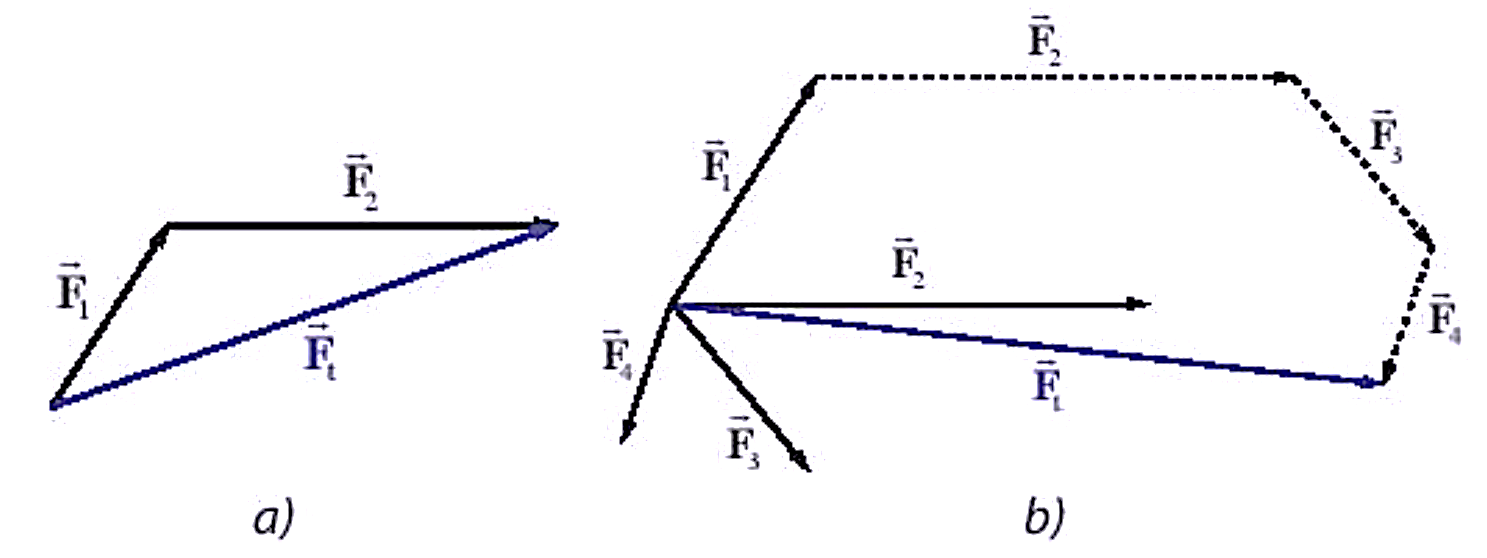 - Quy tắc tam giác lực: Ta có thể tịnh tiến vector lực \(\vec{F_2}\) sao cho gốc của nó trùng với ngọn của vector lực \(\vec{F_1}\). Khi này, vector lực tổng hợp \(\vec{F_t}\) là vector nối gốc của \(\vec{F_1}\) với ngọn của \(\vec{F_2}\).- Khi vật chịu tác dụng của nhiều hơn hai lực. Ta có thể áp dụng một cách liên tiếp quy tắc tam giác lực để tìm hợp lực. Quy tắc này gọi là quy tắc đa giác lực.