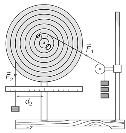 - Dùng 1 đĩa tròn có trục quay đi qua tâm O, trên mặt đĩa có những lỗ dùng để treo quả cân. Tác dụng vào đĩa những lực \(\vec{F_1}\) và \(\vec{F_2}\) nằm trong mặt phẳng của đĩa sao cho đĩa đứng yên. Khi đó ta có:\(F_1.d_1=F_2.d_2\)