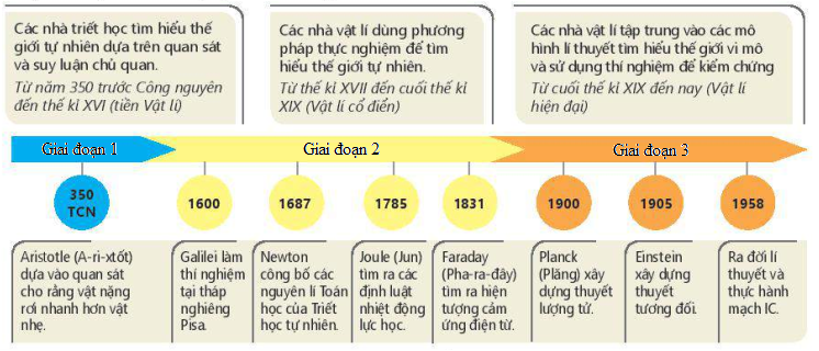 - Giai đoạn 1: Các nhà triết học tìm hiểu thế giới tự nhiên dựa trên quan sát và suy luận chủ quan: từ năm 350 trước Công nguyên đến thế kỉ XVI (tiền Vật lí)- Giai đoạn 2: Các nhà vật lý dùng phương pháp thực nghiệm để tìm hiểu thế giới tự nhiên: từ thế kỉ XVII đến cuối thế kỉ XIX (Vật lí cổ điển)